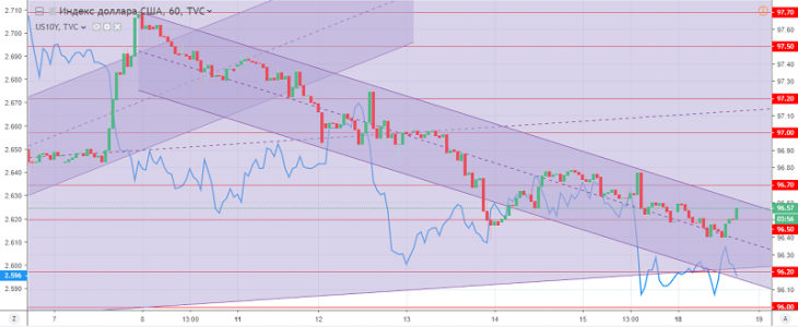 Графік індексу долара США. Поточна ціна – 96.60 (прибутковість 10-ти літніх держ. облігацій – синя лінія)