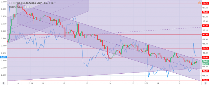 Графік індексу долара США. Поточна ціна – 96.40 (прибутковість 10-ти літніх держ. Облігацій – синя лінія)