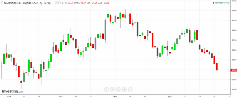 Так, тиждень, що минає став однією з найбільш негативних для американської валюти з листопада. Індекс долара США оновив мінімум трьох місяців і залишається в спадному тренді, тим самим підтверджуючи спадні очікування. Індекс долара закриває рік біля річного мінімуму, що в майбутньому може вказувати на збереження глобального спадного тренда.