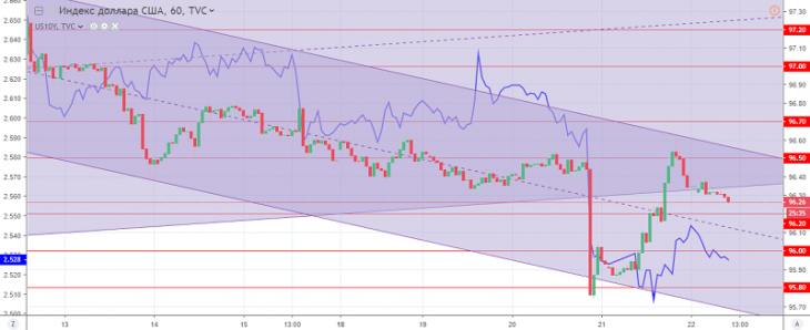 Мал. Графік індексу долара США. Поточна ціна – 96.30 (прибутковість 10-ти літніх держ. облігацій – синя лінія)