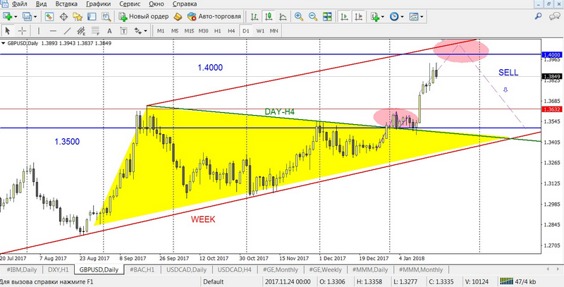 Чітко відпрацював трикутник (виділено жовтим кольором), сформований лініями опору/підтримки тижневого і денного таймфремів. Потенціал його відпрацювання збігається з психологічно сильним рівнем опору в зоні 1.4000, і як раз на нього направлена вся моя основна увага. Саме від нього я і бачу основний потенціал для торгівлі на продаж. Але будьте дуже обережні, так як торгівля на продаж в поточний середньостроковий момент суперечить основним настроям ринку, тобто суперечить тренду. Але в цьому і весь «ЦИМЕС», як кажуть знаючі толк в торгівлі люди. )