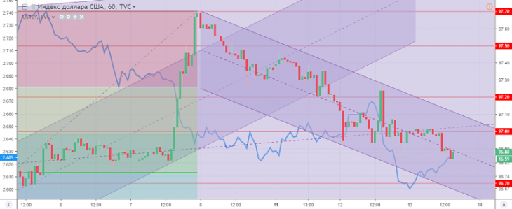 Реакція долара США на опубліковану статистику залишається вельми стриманою, що обумовлено повною концентрацією ринку на даних по Великобританії. Основне зниження американця протягом дня простежується проти золота, що вказує на втечу інвесторів від ризиків. Подальше зниження індексу долара США буде обмежуватися рівнем підтримки 96.70-80.