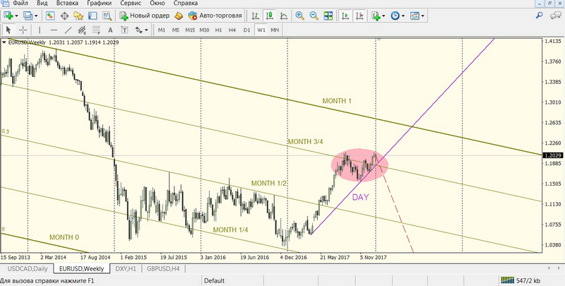 Як Ви бачите, ринкова ціна змістилася в останні три чверті каналу і, перебуваючи в цьому діапазоні ймовірності розвороту і повернення до основної тенденції тренда, переважає над потенціалом розвороту, особливо в зонах найбільш ліній каналу, в нашому випадку це лінія MONTH ¾. У перспективі пробиття висхідної лінії підтримки денного тренда DAY сформує дуже сильний сигнал до розвороту й формування фігури технічного аналізу «подвійна вершина».