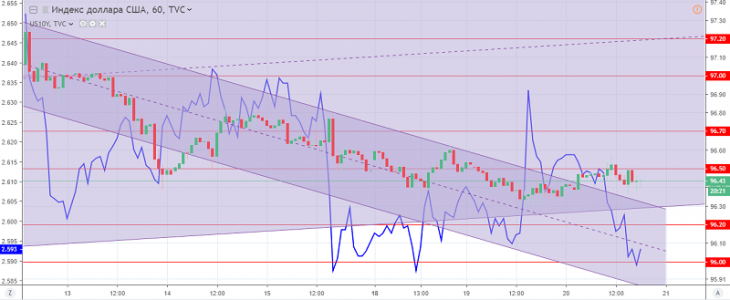 Мал. Графік індексу долара США. Поточна ціна – 96.40 (прибутковість 10-ти літніх держ. облігацій – синя лінія)