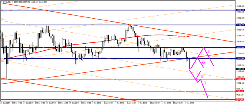 Технічний аналіз: Сьогодні ціна біткоіну закріпилася нижче лінії підтримки висхідного каналу на Н4, при цьому опустившись нижче значимого рівня підтримки на позначці $ 12 000,00. Наступний значимий рівень підтримки розглядається біля позначки $ 10 600,00, пробіття якої відкриє шлях до позначок $ 9 300,00; $ 8 400,00. Основні рівні опору розглядаються у відміток $ 12 800,00; $ 14 000,00.
