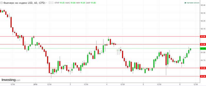 Індекс долара США, після даних по зайнятості, помітно зміцнився через збереження оптимізму щодо зростання процентних ставок в США. В результаті чого, на графіку індексу сформувалося певне дно, яке вказує на уповільнення спадного тренда. Також, на індексі долара формується фігура «подвійне дно», що в подальшому може вказувати на розворот спадного тренда. Рівні опору: 91.90 та 92.00, підтримки: 91.60 та 91.50.