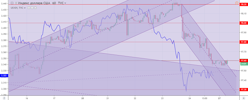 The US dollar index at the end of Friday has updated a low at the level of 97.60-50, thereby having won back the growth of the last week. In fact, the dollar index retained its potential for decline, limited to oversold and support levels: 97.50 and 97.30.