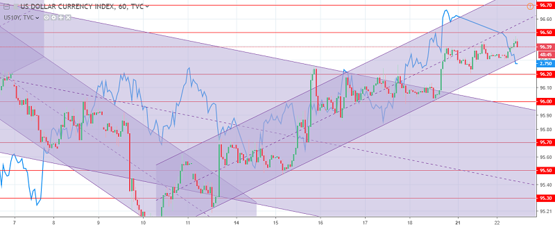 The US dollar index chart. The current price is 96.40 (10-year government bonds yield is the blue line)