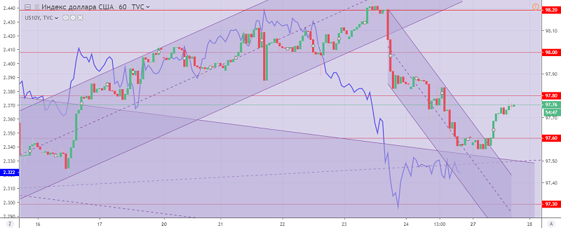 The US dollar index was traded with a strengthening throughout the day, forming a movement against Friday, but maintaining a downward trend and continuing to limit itself to resistance 97.80 and 98.00. Support is located on the marks: 97.60 and 97.50.