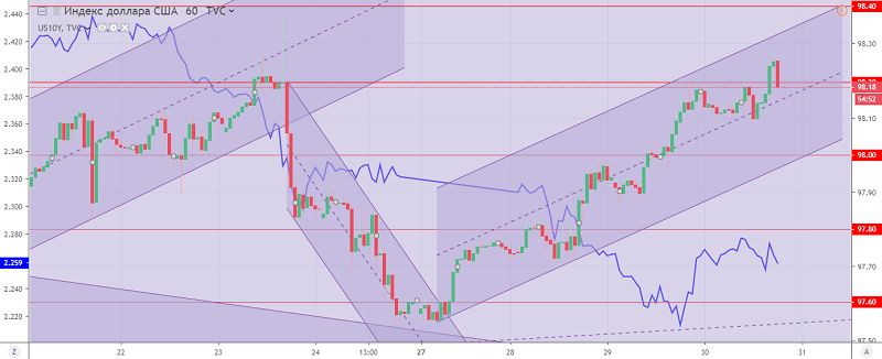 Fig. The US dollar index chart. Current price – 98.20 (10-year government bond yield – blue line)