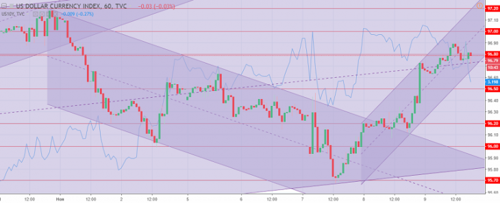 The US dollar index chart. The current price is 96.80 (10-year government bonds yield is the blue line)
