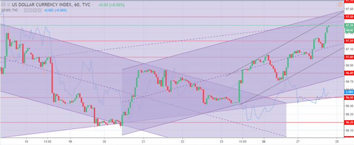 The US dollar index chart. The current price is 97.40 (t10-year state bonds yield is the blue line)