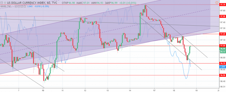 The US dollar index chart. Current price – 97.20 (10-year government bonds yield – blue line)