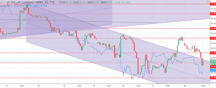 The US dollar index on the basis of a short trading day on Monday returned to a downward trend and consolidated below the level of 96.70, in fact indicating a resumption of the decline, which is limited to the support of 96.50. More significant support is located at levels: 96.20 and 96.00.
