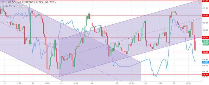 The US dollar index chart. The current price is 96.70 (10-year government bonds yield is the blue line)