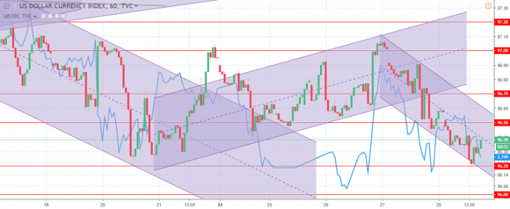 The US dollar index chart. The current price is 96.40 (10-year government bonds yield is the blue line)