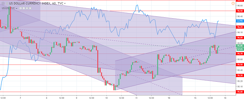 The US dollar index chart. The current price is 95.90 (10-year government bonds yield is the blue line)