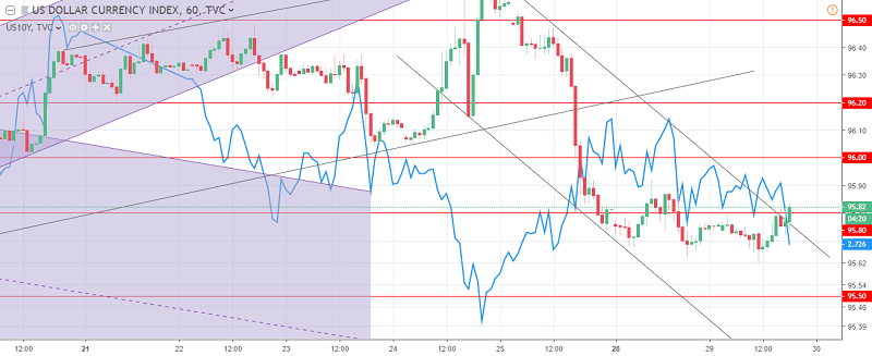 The US dollar index. The current price is 95.80 (10-year government bonds yield is the blue line)