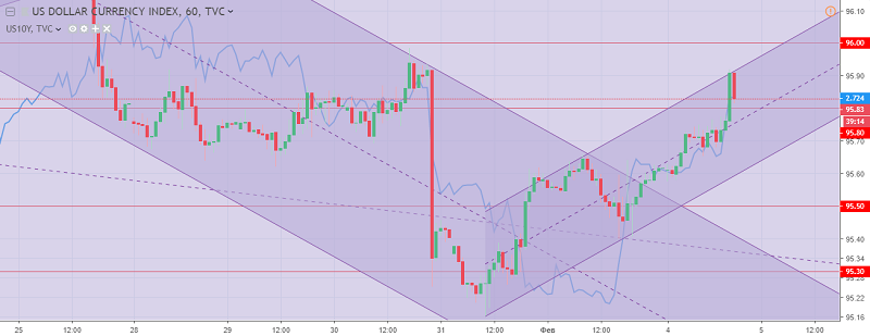 The US dollar index chart. The current price is 95.80 (the yield on 10-year government bonds is the blue line)