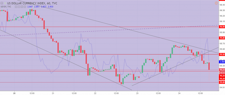 The US dollar index chart. The current price is 95.20 (10-year government bonds yield is a blue line)