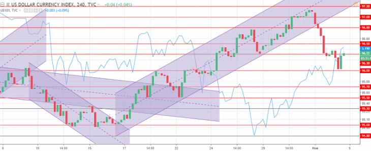 The US dollar index H4 chart. The current price is 96.30 (10-year government bonds yield is the blue line)