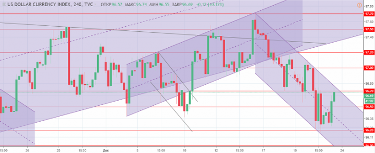 As a result of the week, the US dollar index closes with the December low at 96.20. Friday’s trades, in turn, are closed with growth on the correction of short positions before long weekends in the world due to the celebration of Christmas. It should be noted that the downward trend in the dollar is preserved, and the correction is limited to the levels: 96.70-80 and 97.00. A decrease in liquidity during the holiday period may cause the formation of a flat.