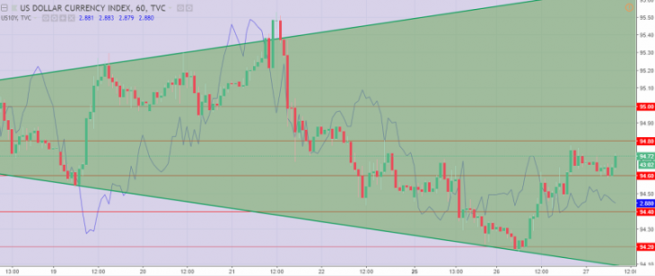 US dollar index Graph.The current price is 94.70 (the yield of 10-year government bonds is a blue line)