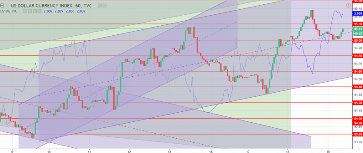 The US dollar index chart. The current price is 95.10 (10-year government bonds yield is a blue line)
