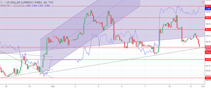 The US dollar index chart. The current price is 95.50 (10-year government bonds yield is a blue line)