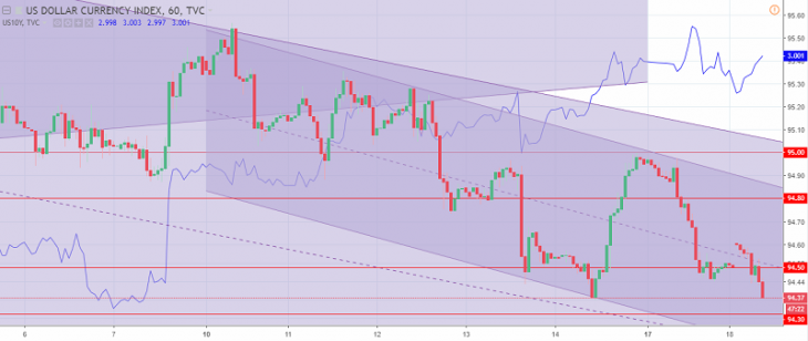 The US dollar index chart. The current price is 94.40 (10-year government bonds yield is a blue line)