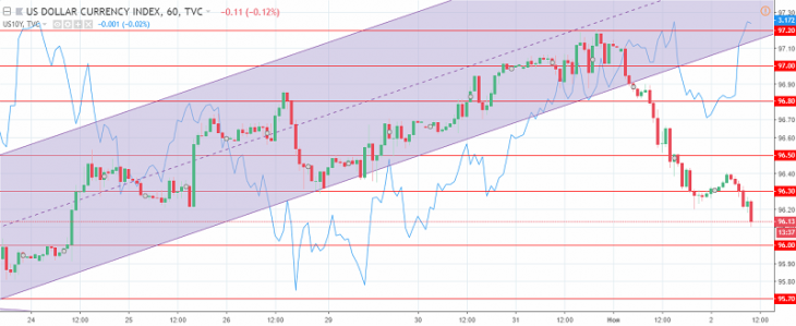 The US dollar index chart. The current price is 96.20 (10-year government bonds yield is the blue line)