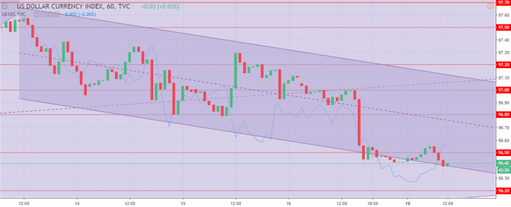 The US dollar index chart. The current price is 96.40 (10-year government bonds yield is the blue line)
