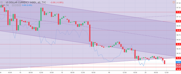 The US dollar index closed Monday’s trading at 96.20, which confirms the continuation of the downtrend and the ability to test the psychological level of 96.00, which also serves as the lower limit of the general uptrend in the dollar.