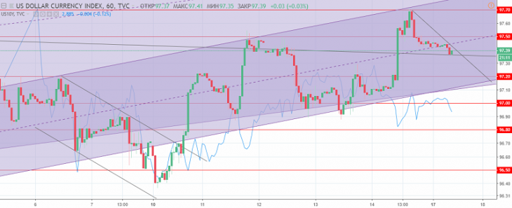 Friday trades on American session closed very differently, which was caused by the corrective movement after the American dollar growth across the market. The American session of Monday was more descending on correction after growth and repulse from the resistance level of 97.70. This level also made the upper boundary of the ascending channel, the repulse from which confirmed keeping the existing trading range.