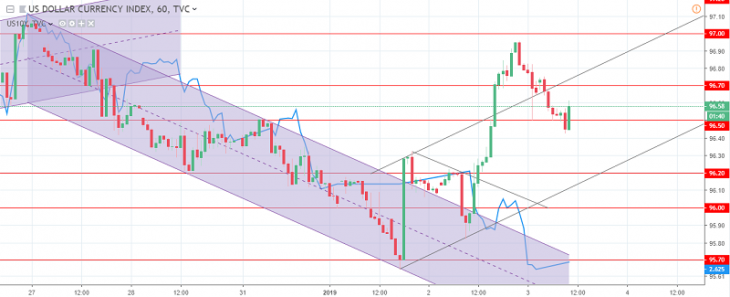 The US dollar index chart. The current price is 96.20 (10-year government bonds yield is the blue line)