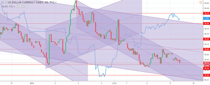 The US dollar index chart. The current price is 95.80 (10-year government bonds yield is the blue line)