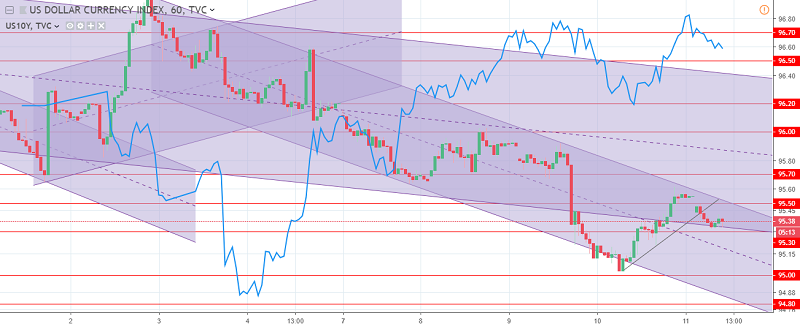 The US dollar index chart. The current price is 95.40 (10-year government bonds yield is the blue line)
