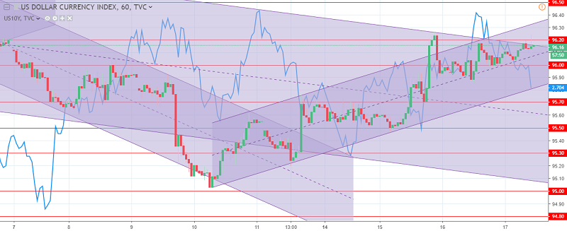The US dollar index chart. The current price is 96.10 (10-year government bonds yield is the blue line)