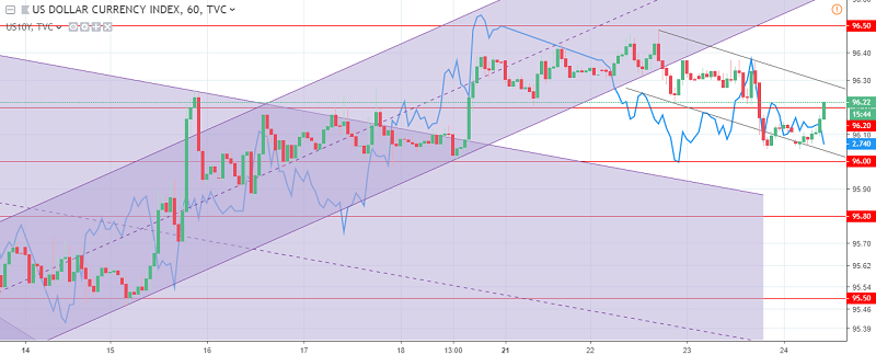 The US dollar index chart. The current price is 96.20 (10-year government bonds yield is the blue line)