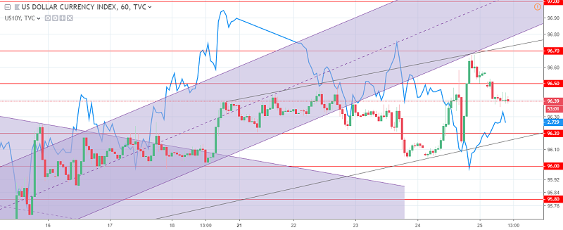 The US dollar index chart. The current price is 96.40 (10-year government bonds yield is the blue line)