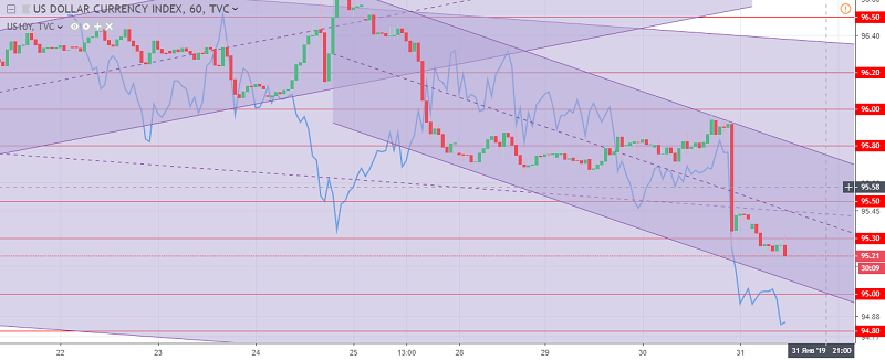 The US dollar index chart. The current price is 95.20 (10-year government bonds yield is the blue line)