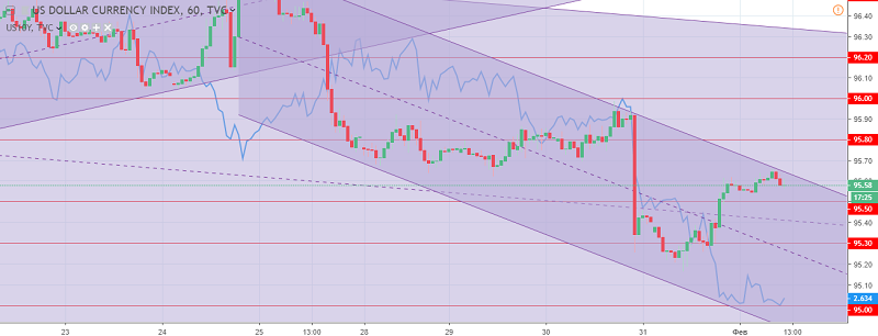 The American dollar’s downtrend is limited by overbought and resistance levels of 95.70-80, which may indicate attempts to reduce to support levels: 95.30 and 95.10-00.