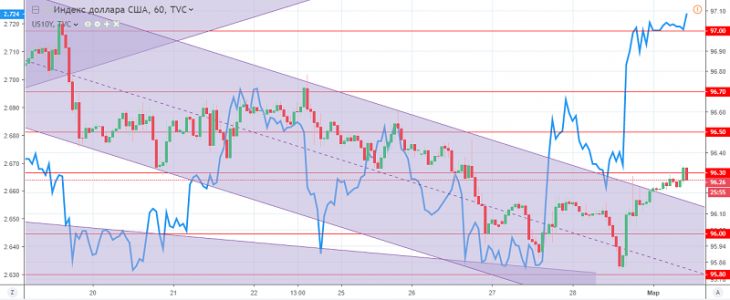 The US dollar index chart. The current price is 96.20 (10-year government bonds yield is the blue line)