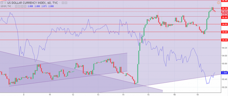 US dollar index Graph. The current price is 95.10 (the yield of 10-year government bonds is a blue line)