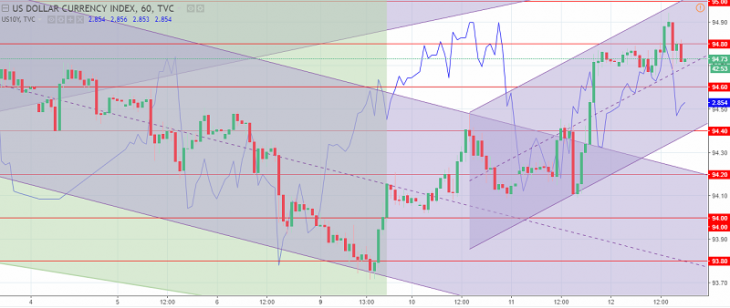 The US dollar index chart. The current price is 94.70 (10-year government bonds yield is a blue line)