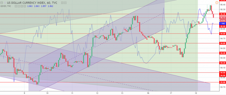 The US dollar index chart. The current price is 95.10 (10-year government bonds yield is a blue line)