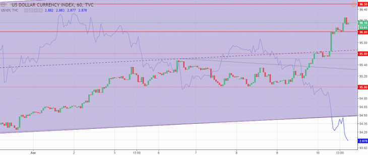 The US dollar index chart. The current price is 96.20 (10-year government bonds yield is a blue line)