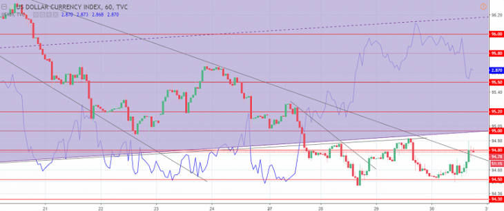 The US dollar index chart. The current price is 94.80 (10-year government bonds yield is a blue line)