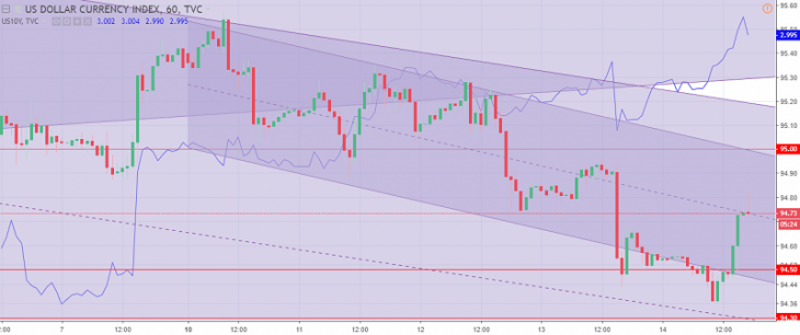 The US dollar index chart. The current price is 94.70 (10-year government bonds yield is a blue line)
