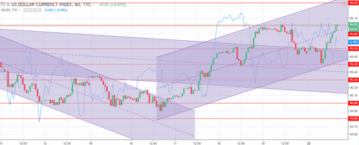 The US dollar index chart. The current price is 96.00 (10-year government bonds yield is the blue line)